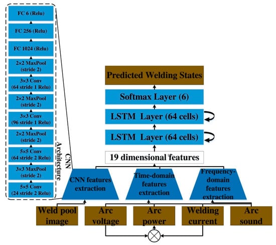 RNN and CNN have their own advantages under different application conditions. With the continuous development in sensing technology and the continuous improvement in welding quality requirements, the application of deep neural network technology is not limited to a single network structure, but is more inclined to the fusion of multiple network structures, when facing the same goal, divides the task goals into blocks, and uses the best network structure for each block to maximize the advantages of each network model. Liu et al. [83] combined the advantages of CNN and LSTM for high-quality online monitoring of automatic welding, the CNN–LSTM algorithm establishes a shallow CNN to extract the primary features in the molten pool image, the feature tensor extracted by the CNN is transformed into the feature matrix, in which the rows are fed into the LSTM network for feature fusion. The accuracy of defect detection in a CO2 welding molten pool reached 94%. Chen et al. [84] proposed a hybrid network model with high accuracy and robustness for the multisensor system. As shown in Figure 14, the visual feature of weld pool images and the time–frequency domain features of arc voltage, welding current, arc power, and arc sound is extracted by CNN and other mathematical methods. The LSTM network is used to fuse the extracted 19 dimensional features and learn time series information from the fused features. Yang et al. [85] introduced an innovative method for locating welding defects using an encoder–decoder network architecture and an attention-guided segmentation network. In order to minimize the loss of important information in the deep encoder module caused by multiple convolution and pooling operations, they incorporated an enhanced attention block and a bidirectional convolutional long short-term memory (BiConvLSTM) block into the skip connections between the encoder path and the decoder path. This integration allows the model to capture global, long-range contexts and highlight regions of interest. As a result, it is able to accurately identify welding defect areas and improve the segmentation ability for microdefects. From the above research, it can be found that the idea of model fusion can make different neural network structures work together to maximize their respective advantages, effectively improving accuracy and versatility.