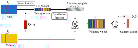 After obtaining the energy score e, the energy scores are mapped to attention weights α through attention distribution function g. To manage different tasks and data structures, many kinds of distribution functions have been proposed, such as softmax [90], sparsemax [92], and logistic sigmoid [93]. The context vector c then is computed by a function that returns a single vector given the set of values and their corresponding weights. From this, the attention mechanism is added to the original vector.