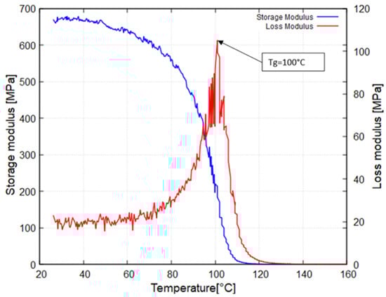 Figure 2 shows the storage and loss moduli curves versus temperature. The loss modulus increases with the decrease of the storage modulus until reaching a maximum point, and then both curves decrease. The Tg temperature value is equal to 100 °C. This value is obtained using the peak of the loss modulus curve, as illustrated in Figure 2.