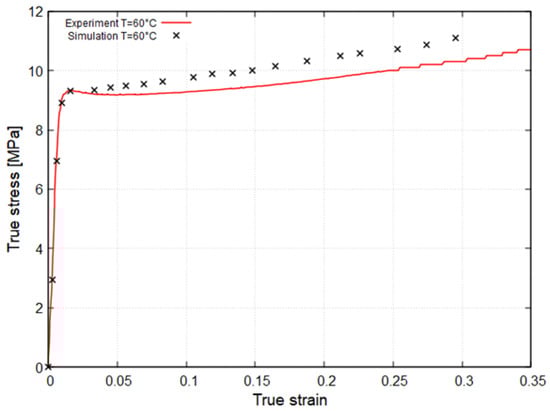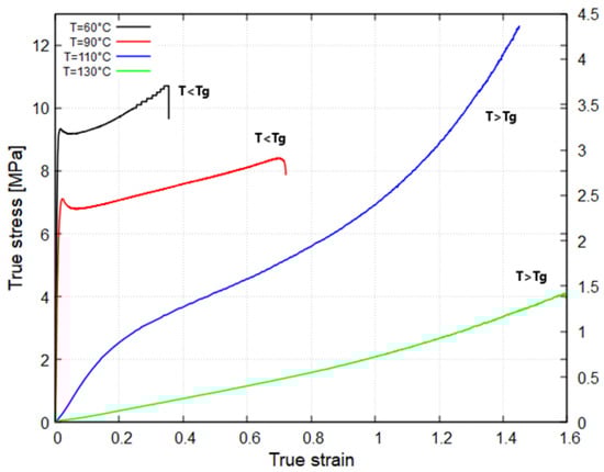 Figure 4 shows true stress–true strain curves obtained at different temperatures; these curves illustrate the temperature effect on the HIPS behavior. For temperatures below Tg, the material has a glassy behavior and deforms until failure. For temperatures above Tg, the material presents a rubbery behavior.
