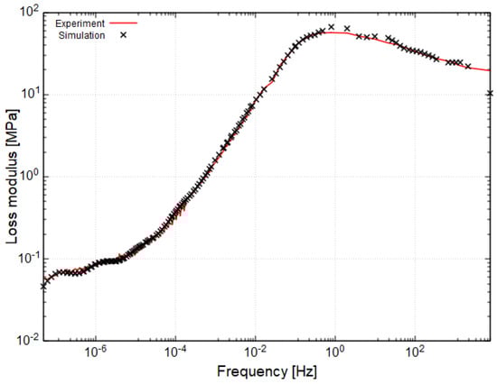 where is the long-term modulus once the material is relaxed and are the relaxation times. The parameters , , and have been determined through inverse identification using experimental data from DMA tests. Figure 8 and Figure 9 demonstrate a good correlation with the experimental and numerical data for loss modulus and storage modulus.