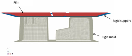 The thermoforming process of the HIPS sheet of 1.4 mm thickness was simulated numerically using the thermo-visco-hyperelastic model. As shown in Figure 10, the numerical model is made of three parts: a mold, a HIPS sheet, and a support to hold the sheet. The mold and the support were modeled as isothermal rigid bodies, incapable of deformation but capable of contact and thermal interaction with the sheet, allowing conduction in the presence of contact and even a small gap [27]. The HIPS sheet is meshed with shell elements (S4RT).