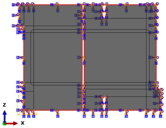 The rectangular sheet was blocked on its outboard edges, as shown in Figure 11, and a very low pressure (0.1 bar) was applied on its surface, as shown in Figure 12, for the pre-stretching step. Then, a displacement was imposed on the mold and, finally, a negative pressure was applied to the sheet so that it took the shape of the mold. The Table 4 and Table 5 provide a summary of all the boundary conditions and loads.