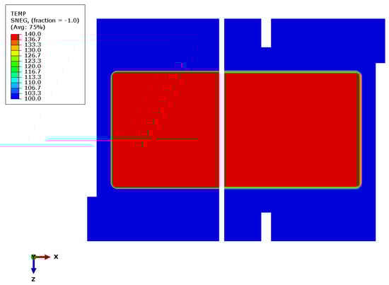 Figure 16 shows the temperature distribution during the various stages of the simulation. During the pre-stretching step, the sheet is not in contact with the mold, and as a result, its temperature has not yet changed. It remains consistent with the initially imposed temperatures. For the second step, the mold comes into contact with the sheet. Due to the thermal contact, the temperature of the areas of the sheet in contact with the mold decreases. After the vacuum step is completed, all the surfaces of the sheet take on the shape of the mold, resulting in a decrease in temperature.
