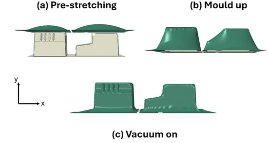 Steps of the numerical simulation. (a): the sheet is mechanically stretched before molding, ensuring uniform thickness. (b): the mold goes up until it touches the film. (c): vacuum pressure is used to remove air from under the sheet and ensure close contact with the mold contours.