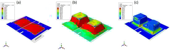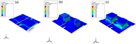 (a) Distribution of von Mises stress during the pre-stretching step, (b) distribution of von Mises stress during the mold-up step, and (c) distribution of von Mises stress during the vacuum on the step.