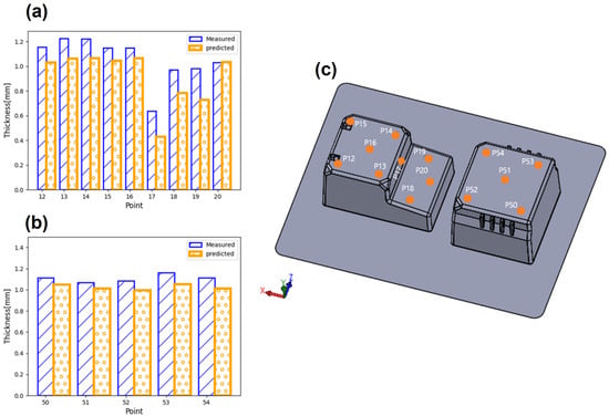 (a,b) Thickness distribution on side 2. (c) Experimental measurement points of the thickness on side 2.
