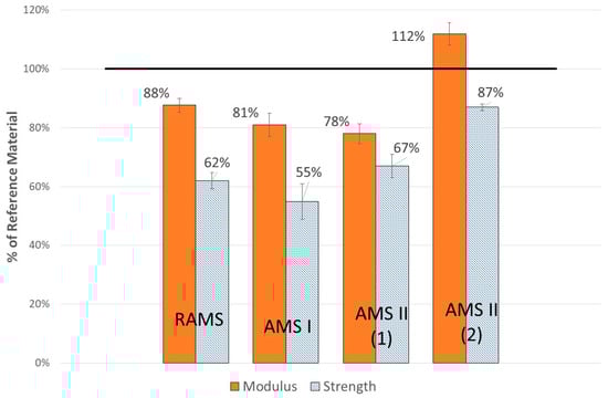 | Flexural | ISO 14125 3-point test [55] | Flexural Strength Flexural Modulus Flexural Strain at Max Load | 1 | RT | 3 |