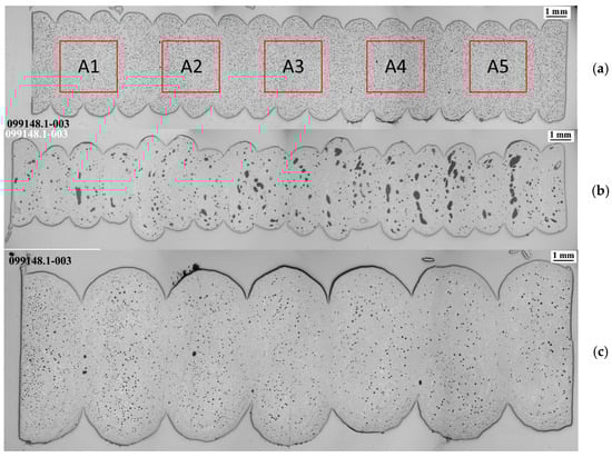To calculate the percentage of the porosity of the printed specimens, an analysis of the volumetric fraction of each case in our study was performed following an internal procedure based on the ASTM E562 standard [64]. Therefore, after the test specimen preparation, five representative and homogeneous areas of the total area illustrated in each macrograph of Figure 11 were selected, as shown in Figure 11a, which analyses the percentage in the area of interest.