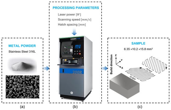 Prismatic samples measuring 15.8 × 10.2 × 6.35 mm³ (Figure 1) were fabricated using a Concept Laser equipment model MLAB 200R through laser powder bed fusion (LPBF). The equipment has a 200 W (Nb: YAG) fiber laser featuring a focused beam diameter of approximately 80 μm and a wavelength of 1070 nm. The working chamber was sealed during operation and supplied high-purity nitrogen, reducing the oxygen content to less than 800 ppm. The powders were deposited on a 16 mm thick 316L stainless-steel support plate of 100 mm × 100 mm in area. The processing parameters are reported in Table 3. A meander scan pattern was employed, with the scan direction rotated by 67° in each successive layer.