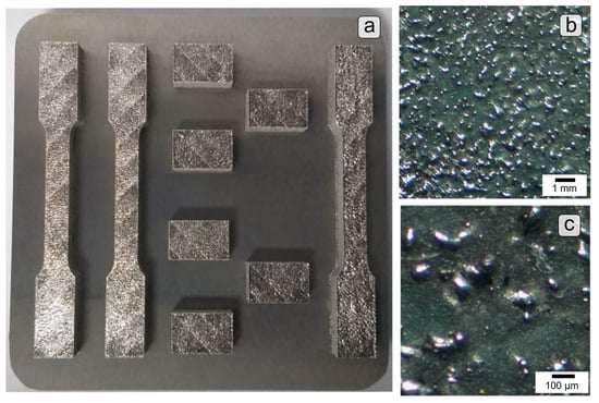 Figure 2a shows the printed samples, where the first characteristic that stands out is the poor surface quality. Figure 2b,c show a magnification of 5 and 60×, respectively, to appreciate the balling formation on the surface of the additively manufactured specimens. The as-built roughness (Ra) at the surfaces was around 10 ± 2 μm.
