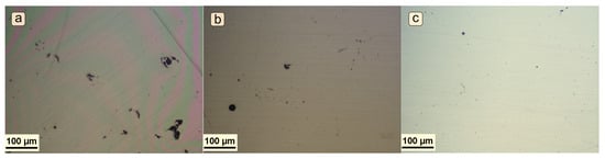 Figure 3 shows a representative image of the porosity level, illustrating the scanning speed effect on the processed samples. At the same laser power (160 W) and hatch spacing (40 µm) but at different scanning speeds, at a scanning speed of 1100 mm/s, there were irregular porosities due to insufficient VED to melt the metal powders, which can compromise the mechanical properties and integrity of the parts (Figure 3a). Figure 3b shows round porosities associated with gas entrapped inside the metal powder, which can also affect the structural performance of the samples [41]. Finally, Figure 3c shows a more homogenous surface topography (700 mm/s). The cross-section porosity measured by image analysis shows a relative density of 96.68%, 97.41%, and 99.70%, respectively.
