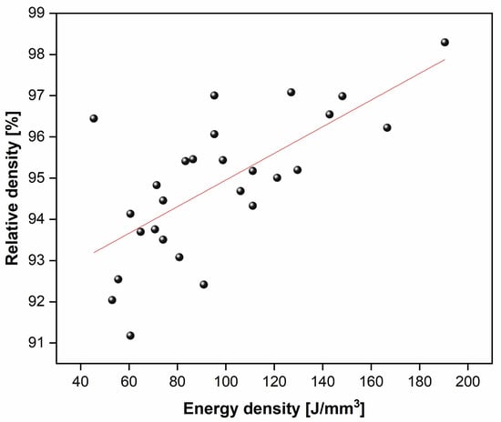 Figure 4 shows that a higher relative density is obtained as the volumetric energy density increases. It is worth noting that despite having VED with close values, the relative density results vary. This is because some processing parameters have a greater influence on the relative density, as detailed in Table 4. It should be noted that these results are specific to the manufacturing equipment used. Therefore, higher VED can be obtained with the same scanning speed and hatch spacing parameters in higher-power laser equipment. In addition, the geometry and the scanning strategy also influence the densification of the specimens.