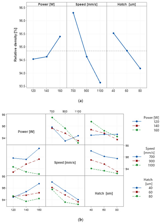 Summary of the effects of processing parameters over relative density in 316L stainless steel processed by LPBF: (a) main effects plot; (b) interactions plot.