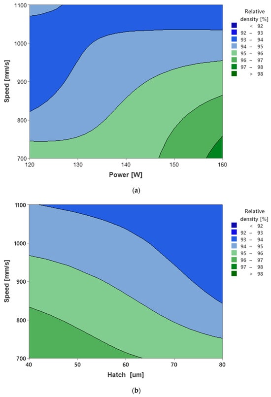 Figure 6 shows the contour plots of the interaction between scanning speed with laser power and hatch spacing. In Figure 6a, the highest relative density was obtained with the lowest speed and the highest power. In Figure 6b, the highest relative density was obtained with the lowest speed and hatch spacing.