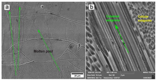 Figure 8a shows a representative SEM micrograph of the molten pool. Within each molten pool (Figure 8b), it is possible to observe the formation of both cellular and columnar sub-grains. The green arrows indicate the direction of growth of the columnar grains. Epitaxial growth is favored by the direction of the thermal gradient, which leads to the formation of large columnar grains, as shown in Figure 7.