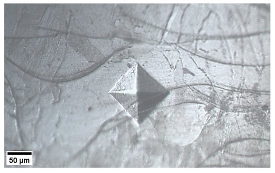 The microstructure of a material is directly connected to its mechanical properties. In the context of additively manufactured samples, the yield strength, microhardness, and wear resistance are significantly influenced by the characteristics of the grains and sub-grains, as recently reported in [46,47]. Figure 9 shows a representative indentation response of the austenitic stainless steel beneath a molten pool.