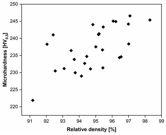 The average microhardness obtained was around 237 ± 9 HV0.5. These results agree with those reported in [32,35,39,48]. Moreover, microhardness shows a linear relationship with relative density, i.e., the higher the density, the higher the microhardness (Figure 10) [49]. It is worth noting that, despite having relative densities with close values, the microhardness results vary. This is because some processing parameters have a greater influence on the microhardness, as detailed in Table 6.