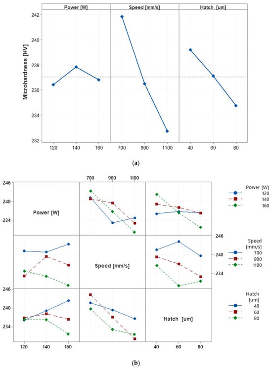 Effects of processing parameters over microhardness in 316L stainless steel processed by LPBF: (a) main effects plot; (b) interactions plot.