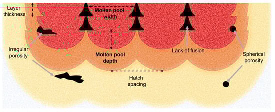 Processing parameters influence molten pool dimensions. By examining Figure 12, it is possible to infer that when the hatch spacing is excessively large, and the supplied volumetric energy density (VED) is insufficient, the molten pool width fails to surpass the hatch. Consequently, a lack of fusion occurs due to insufficient VED, as indicated near the red molten pools. Conversely, when there is an excess of VED, the occurrence of balling is observed as the molten pool becomes excessively large or deep [27], as denoted by the yellow molten pools. It is essential for the molten pool depth to be adequate to penetrate the layer thickness and melt a percentage of the previous layers (illustrated by the orange molten pool), while the molten pool depth serves as a determinant of melting efficiency. Typically, the width exceeds the diameter of the laser beam. In the case of a layer thickness of around 30 μm, the depth is recommended to fall within the range of 50 to 80 μm to ensure proper anchoring to the layer below. Additionally, the width should not be less than the laser focus, for instance, 100 μm.