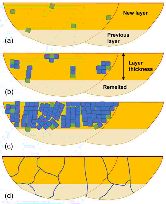 Schematic crystal nucleation and grain growth representation during laser-based powder bed fusion solidification: (a) nuclei of crystallization; (b) crystal growing; (c) grain formation; (d) grain boundaries.