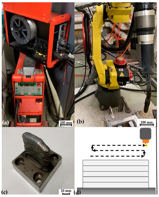 Wire and arc additive manufacturing process representation ((a)—welding system, (b)—manipulator robot, (c)—printed sample, (d)—deposition direction).
