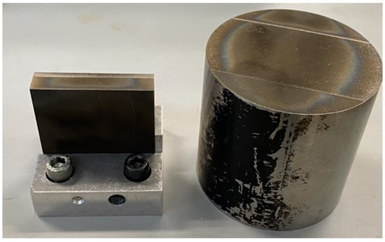 For the fixation of the samples in the machining center, a clamping system was manufactured with dimensions of 50 mm in width and length and 15 mm in height. The system included a slot in the middle of approximately 10.5 mm for the sample to be clamped in. The pieces were secured in the clamp with four m6 screws. The system was secured on the dynamometer with four m8 screws, in the same manner as the WAAM Inconel 718 workpieces.