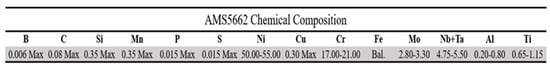 - AMS5662:2016; Nickel Alloy, Corrosion and Heat-Resistant, Bars, Forgings, and Rings 52.5Ni-19Cr3.0Mo-5.1Cb (Nb)-0.90Ti-0.50AI-18Fe Consumable Electrode or Vacuum Induction Melted 1775 °F (968 °C) Solution Heat Treated, Precipitation-Hardenable. SAE International: Warrendale, PA, USA, 2016. [CrossRef]