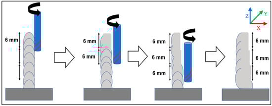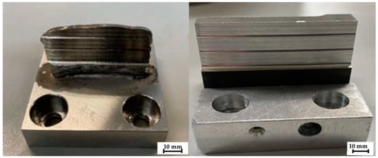 Similarly, the deposition delay (cooling time) aims to minimize these distortions. The deformation of the samples can be reduced by reducing the buildup temperature due to the cooling time so that the overall maximum temperature is diminished. For simplicity, in other parts of this paper, the workpieces manufactured using this method are referred to as “WAAM samples”.