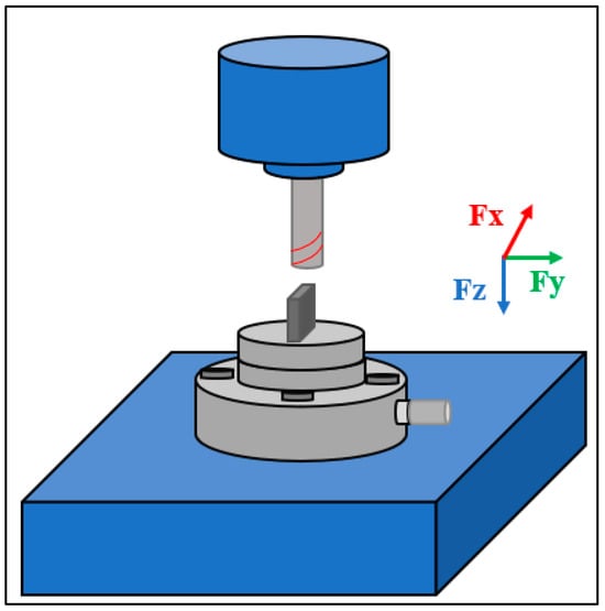 The setup for the cutting force acquisition system is shown in Figure 6. Those figures present different representations of coordinate systems, with Figure 5 representing the “real” coordinates regarding the machining center and workpiece setup and Figure 6 describing the coordinates of the cutting forces obtained by the acquisition system. This meant that the directions of the recorded forces might differ according to the dynamometer setup, requiring a posterior adjustment to the cutting force results.