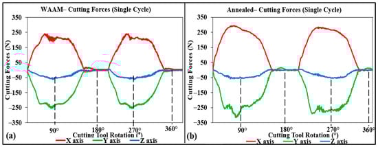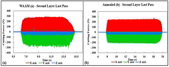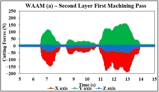 To evaluate the maximum cutting forces, only the last machining pass for each height was analyzed, with the idea of only assessing the machining of a flat surface. Owing to the surface deformation of the WAAM samples, as shown in Figure 1c, the amount of material being cut (cutting depth) may vary, resulting in differences in the cutting forces. To exemplify this variation in the cutting forces owing to the deformation of the samples, Figure 7 presents one graph representing the cutting forces for the first machining pass on the second height (12 mm) for case (a).