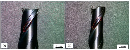 One example of pictures of cutting tools after machining for each type of material (WAAM (a), AMS5662 (b)) is present in Figure 8, highlighting the area of wear by a red circle, that was considered of low impact to the cutting procedure.