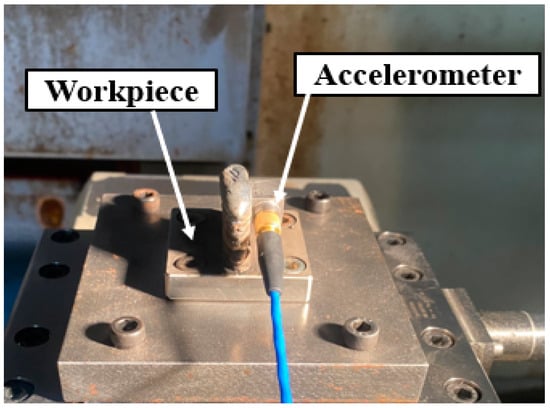 Another important observation to be made is regarding the stability of the cutting procedure. Being a new kind of setup and a different kind of sample to be machined, it was deemed important to consider the possibility that problems, such as chatter vibration, would occur during the cutting process; with that, a set of experiments were performed to check that possibility with the aid of an accelerometer. The setup of the experiments is shown in Figure 9.