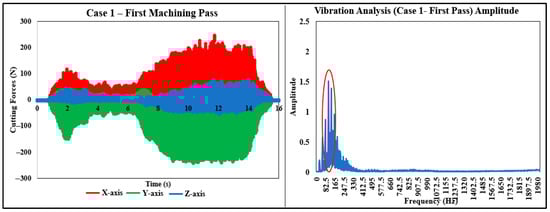 From Equations (1) and (2), it was obtained that the first harmonic for the system in question is 153 Hz, meaning that when vibrations from this range are obtained from the accelerometer, it is assumed that the vibration is the natural frequency for the system and not from some kind of abnormality. One example of the results of cutting forces and frequency of vibration, called Case 1, is shown in Figure 10.