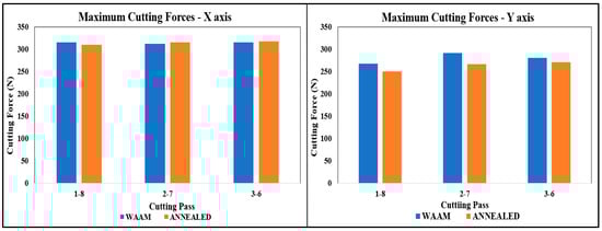 From Figure 11, it can be seen that the cutting force values for the X-axis do not present significant differences, making it possible to consider the same overall maximum value for all cases. Moreover, these values do not increase significantly after multiple cutting passes, indicating that, even though this material is hard to cut, the degree of tool wear was minimal.