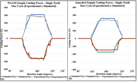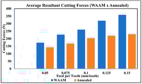 - The simulated results and the values of the average resultant forces also matched the idea that the annealed samples had overall better machinability, presenting lower cutting forces for all tested and simulated results, not only for the values themselves, which was expected, but also regarding their stability when considering the oscillations on cutting forces obtained in the WAAM samples, a fact that was also observed in the graph of the cutting forces for the experimental results.