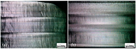 Among AM techniques, wire and arc AM (WAAM) is one of the methods used to manufacture final products. It is based on using arc welding as a deposition process for different metal components. Compared with other AM processes, WAAM has, as its main benefits, a high deposition rate [], lower costs (for both fixed and variable costs), and a higher material use efficiency []. However, its fast deposition process comes with the disadvantage of producing uneven surfaces due to its high heat input and the stair-stepping effect intrinsic to the nature of most AM samples due to the deposition based on layers, which diminishes the surface quality of the WAAM products [].