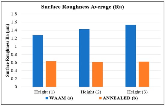 Different sample characteristics are observed in the surface roughness tests after the machining. First, when comparing the WAAM and annealed materials, the latter achieves better results, with lower average surface roughness values and lower variations in the valley peaks and depths. This indicates that the annealed samples are “easier to cut” than the WAAM samples. In addition, the best surface quality overall, as evaluated by the surface roughness tests, was achieved in case (b), i.e., the annealed sample.