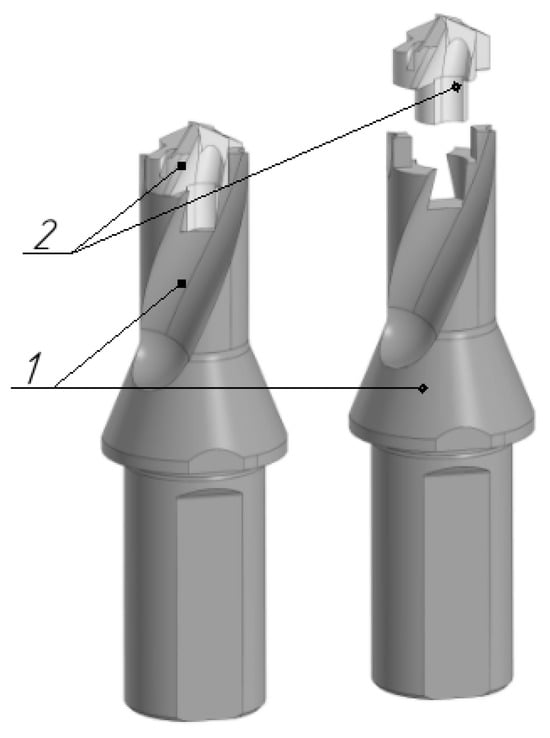 Modern additive manufacturing methods, such as SLM 3D metal printing, can significantly reduce the labor intensity of manufacturing complex-profile parts [6,7,8,9,10,11]. The described technologies make it possible to produce high-strength engineering products from metal powders of various alloys to produce internal cavities and thin walls. The possibility of additive manufacturing of metal products using SLM methods has recently attracted more and more attention from the tool industry. In articles [12,13,14,15,16], researchers propose using 3D-printing for the manufacture of metal-cutting tools, modular cutters and drills, and equipment. In particular, the most relevant area of application for SLM 3D metal printing is the production of prefabricated metal-cutting tool housings (Figure 1), since the presence of cutting heads made of hard alloys or high-speed steel in such a tool allows for highly efficient processing. The housing itself serves for the correct positioning of the cutting plates or heads; for the location of the technological cavities necessary in it, such as cooling channels; and for transmitting torque from the machine spindle to the cutting head.