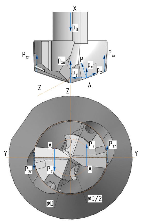 According to [43,44], the cutting force is laid out as shown in Figure 2 for several components of forces, such as Px (the force parallel to the axis of the drill or axial force); Py (the force perpendicular to the drill axis or radial force); and Pz (a tangential force), the vector of which is tangent to the circle on which point A is located, that is, the point of the resultant force. The presented diagram of forces is equal for both drill blades.
