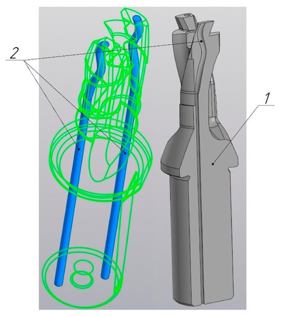 Internal cooling channels of a drill body with spatial curvature: 1—drill body model; 2—profile of cooling channels.