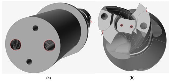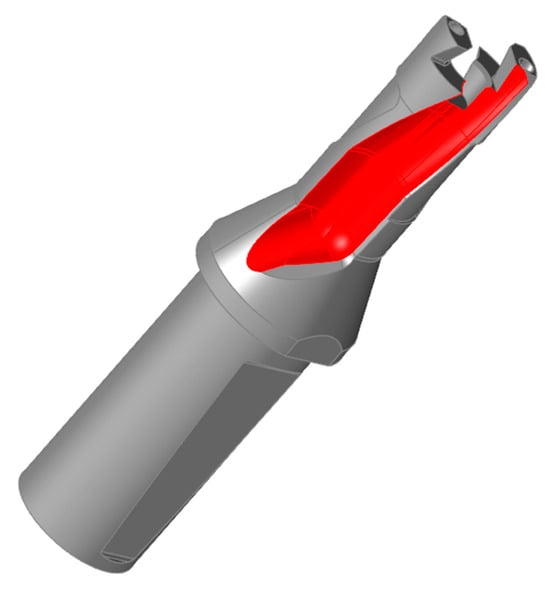 The correct design of the tool shank area also requires a careful analysis of Figure 6. The loads that the drill body shank absorbs when it is clamped in the chuck significantly influence the topological optimization process. The compression forces of the shank from three-jaw, collet, hydroplastic, and other types of chucks are significant, since it is thanks to these forces that torque is transmitted from the machine spindle to the drill body. Consequently, cavities formed during topological optimization cannot be left hollow, as this leads to the deformation of the structure from accompanying loads that are not taken into account in the optimization problem and are perceived by the structure of the drill body. When designing a shank as a thin-wall structure, it is important to provide a bridge from the opposing surfaces of the shank that are subject to clamping forces. In this case, the clamping forces on opposite sides compensate themselves. This can be achieved by filling the voids with a metal polymer that has sufficient compressive strength [32,34].