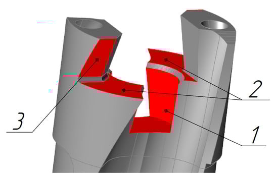 The next question is what should be the minimum thickness of those unchangeable surfaces that are necessary in the design of the drill, but do not experience significant loads. It is advisable to make such surfaces as thin as possible, taking into account the fact that they can subsequently be reinforced with a metal polymer from the inside. But, here, some technological limitations appear. The first technological limitation is what minimum wall thickness a 3D printer can provide. Since the printed workpiece is elongated, if the outer walls are too thin and the thickness of the internal elements varies, internal stresses, ironing, and deformations may occur. In addition, an important factor for the performance of the drill body is the hardness of its outer surfaces, which can subsequently be ensured by chemical–thermal treatment or thermal treatment. From reference [52], it is recommended to use a minimum wall thickness of 2 mm.