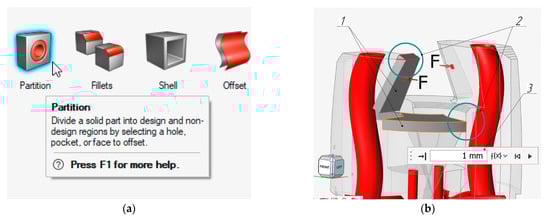 Procedure for specifying an immutable region: (a) “partition” tool icon in the AltairInspire toolbar menu; (b) creation of two unchangeable areas with a thickness of 1 mm: 1—unchangeable areas, 2—zones where the unchangeable areas go beyond the contours of the original model, 3—window for setting the thickness of the unchangeable area.