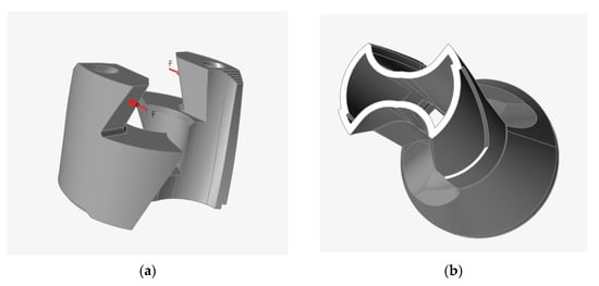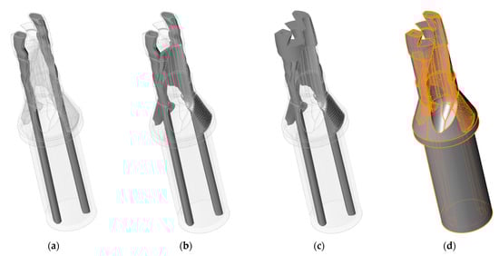 Thus, four parts of the model were obtained; these are the landing head (Figure 9a), the thin-walled middle screw part (Figure 9b), the thin-walled shank (Figure 6), and the cooling channel rods. By connecting these parts together using a Boolean operation and subtracting the resulting region from the original drill model, the region of the topology optimization space (Figure 10) was obtained.