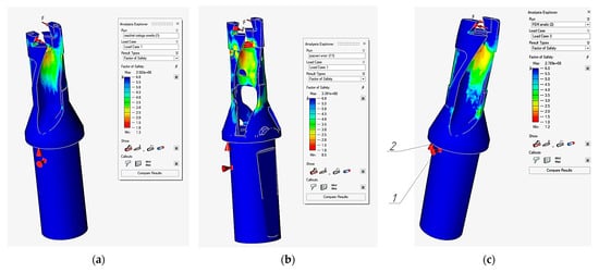 Safety factor diagram of a drill model. (a) A diagram of the safety factor of the solid drill body (min 1.3); (b) a safety factor diagram of the optimized drill body, but without the middle outer part (min 0.5); (c) a safety factor diagram of the optimized drill body (min 1.2); 1 is a symbol of the cylindrical part of the shank, deprived of the ability to move under loads; 2 is a symbol of the end of the conical part of the body, deprived of the ability to move under loads.