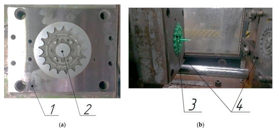 The installation presented in Figure 16 was used for the manufacture of metal-composite mold-forming plates. Figure 17a shows a composite mold plate manufactured in the installation, consisting of a metal frame (1) and a metal polymer mold (2). In Figure 17b, the composite mold (4) is shown, which is mounted on an injection molding machine. The mold consists of a matrix and a punch (4) with metal polymer forming parts (2) made in them. Figure 17b also shows part 3 (gear) cast from polypropylene in a composite mold.