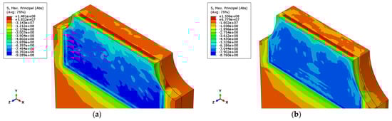 Figure 5 shows the predicted residual stress field obtained after the simulation of the LSP pressure pulse. As observed, LSP produces a particular stress distribution for each case of curvature radius, but, in all cases, compressive residual stresses are produced on the surface. The residual stress profiles along central paths on the specimen mid-plane obtained in the LSP simulation are shown in Figure 6; distance is measured from the LSP-treated surface. The compressive residual stresses are localized in the superficial region of the material, up to a depth of 0.75 mm. At a depth of 0.1 mm, they reach the maximum value, close to 520 MPa in compression. Note that the profile behavior is very similar for all specimens with different notch curvatures; only small differences are appreciated after reaching the peak values (about 100 MPa tensile residual stress). At 1.5 mm depth, a small discontinuity in the stress profiles is also observed; this is due to the change in material, going from Stellite 6 to SS 304.