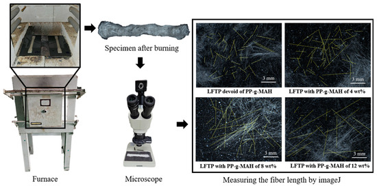 The fiber length of LFTPc was measured using specimens from injection molding. These specimens were placed on the black substrate of ceramic tiles and burned at a temperature of 500 °C for 2 h using a Nabertherm furnace. The decomposition of PP in LFTPc occurred due to the higher degradation temperature of PP, leaving only GF and ash. The GF was distributed, and the fiber length was measured using a microscope (Motic model SMZ-171) at 10× magnification. At least 1000 fibers were sampled and measured using the ImageJ program. The fiber count results were calculated by determining the number of fibers in each range of fiber length per total number of fibers. Figure 2 illustrates the fiber length measuring process of LFTPc.