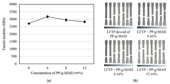 Correlation between (a) tensile modulus and the concentration of PP-g-MAH in LFTPc and (b) testing specimens.